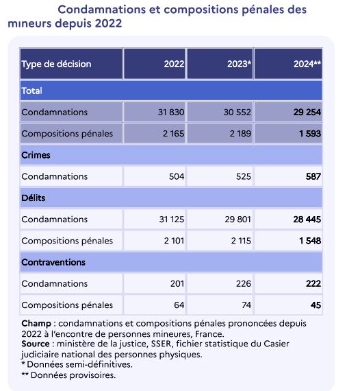 Sur un an, le total des décisions diminue : « les condamnations prononcées contre des personnes mineures sont en baisse de 4 % depuis 2023 », passant de 30 600 à « 29 300 ». Les compositions pénales — dispositif proposé par le procureur à un majeur ou à un mineur de plus de 13 ans qui reconnaît les faits — suivent la même tendance et reculent (1593 en 2024 contre 2189 l'année précédente).