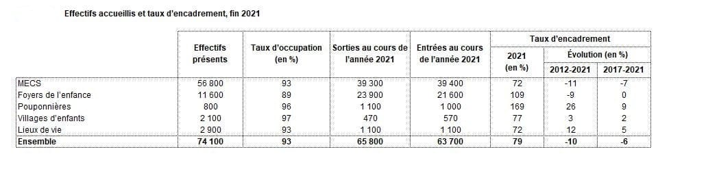 D’après l’enquête ES-PE, 74 000 enfants et jeunes étaient accueillis [majoritairement des garçons (63 %)], fin 2021, dans ces lieux d’hébergement de l’ASE, « en hausse de 21 % par rapport à fin 2017 ». Et de +32 % par rapport à 2012 ; +48 % par rapport à 2008.