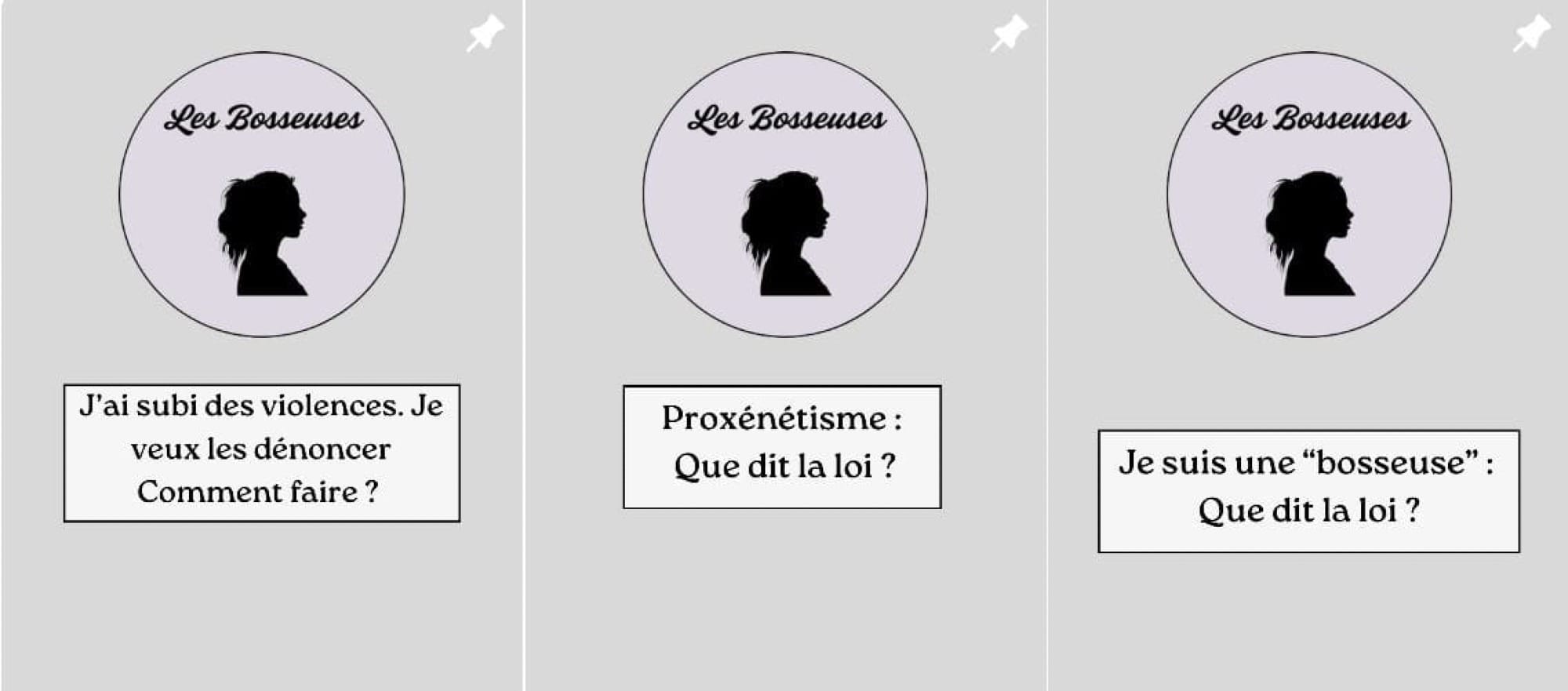 Imaginé par Béatrice Lavaud-Legendre, chercheure au CNRS, Les_bosseuses diffuse les résultats d’une recherche scientifique sur Instagram. Ce compte s’inscrit dans une approche psycho-éducative et vise à aider les jeunes à repérer les logiques d’exploitation et à informer les professionnels sur ces situations.