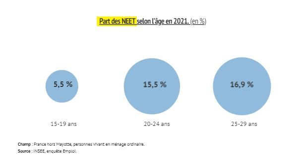 En 2021, 12,4 % des 15-29 ans sont des NEET (Neither in Employment nor in Education or Training), c’est-à-dire qu’ils ne sont ni en emploi, ni en études, ni en formation.