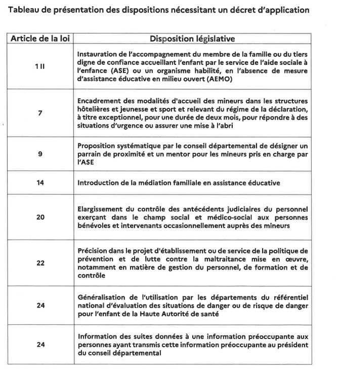 La circulaire comprend en annexe 1 un tableau comparatif des dispositions immédiatement applicables du code civil, du code de l'action sociale et des familles, du code de la sécurité sociale, du code de construction et de l'habitat et du code de l'entrée et du séjour des étrangers et du droit d'asile, modifiées par la loi relative à la protection des enfants du 7 février 2022.