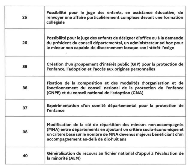 Ces modifications sont relatives à l'assistance éducative et la mesure judiciaire d'aide à la gestion du budget familial, à une meilleure prise en charge des mineurs , à leur protection contre les violences, aux majeurs âgés de moins de vingt-et-un ans et aux mineurs non accompagnés.