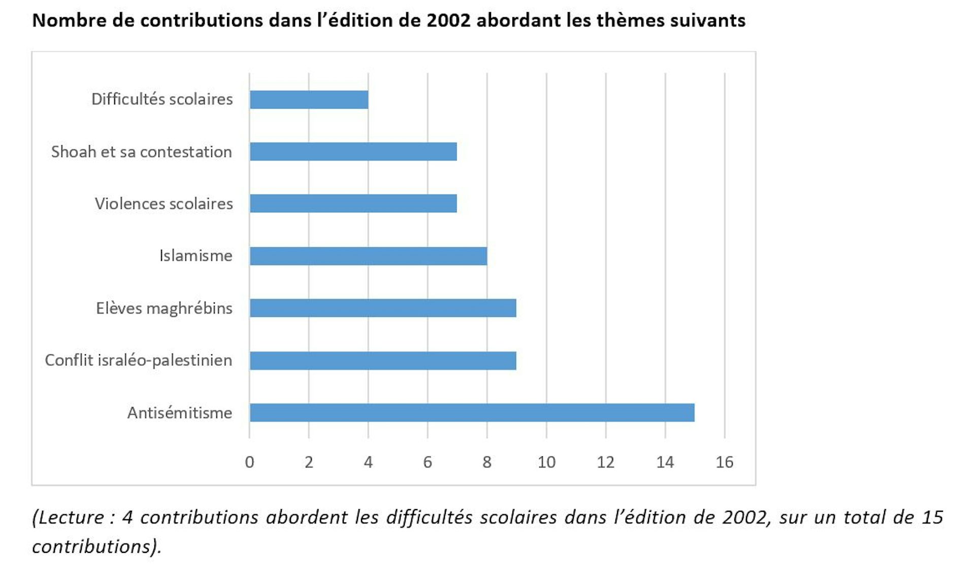 De manière très nette, l’antisémitisme, les élèves maghrébins et le conflit israélo-palestinien constituent les trois thèmes les plus récurrents dans les contributions. Au contraire, les thématiques strictement scolaires (ainsi les difficultés et violences à l’école), certes présentes, sont moins fréquemment évoquées. L’orientation de l’ouvrage est donc explicite : la dénonciation d’un antisémitisme présent chez les élèves maghrébins, et/ou de culture musulmane, ravivé par la « seconde intifada » depuis 2000.