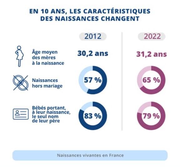 Les femmes âgées de 25 à 34 ans sont les plus concernées par cette tendance. L’Insee pointe qu’entre 2021 et 2022, on enregistre - 2,7 % des naissances pour les mères âgées de 25 à 29 ans et - 3,6 % pour celles âgées de 30 à 34 ans. L'âge moyen de la mère à la naissance de son premier enfant est passé de 29 ans il y a 20 ans à 31 ans en 2022. A contrario, « le nombre de naissances de mères de 40 ans ou plus augmente de 3,3 % entre 2021 et 2022. Cette tranche d’âge est la seule pour laquelle les naissances sont plus nombreuses en 2022 ».